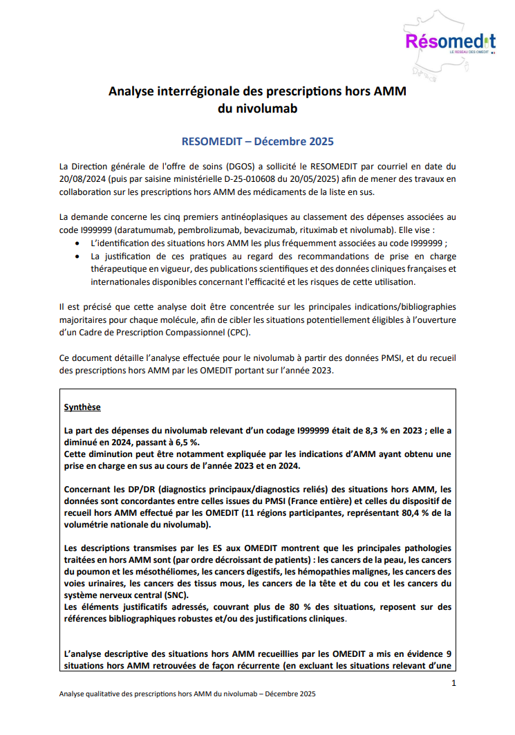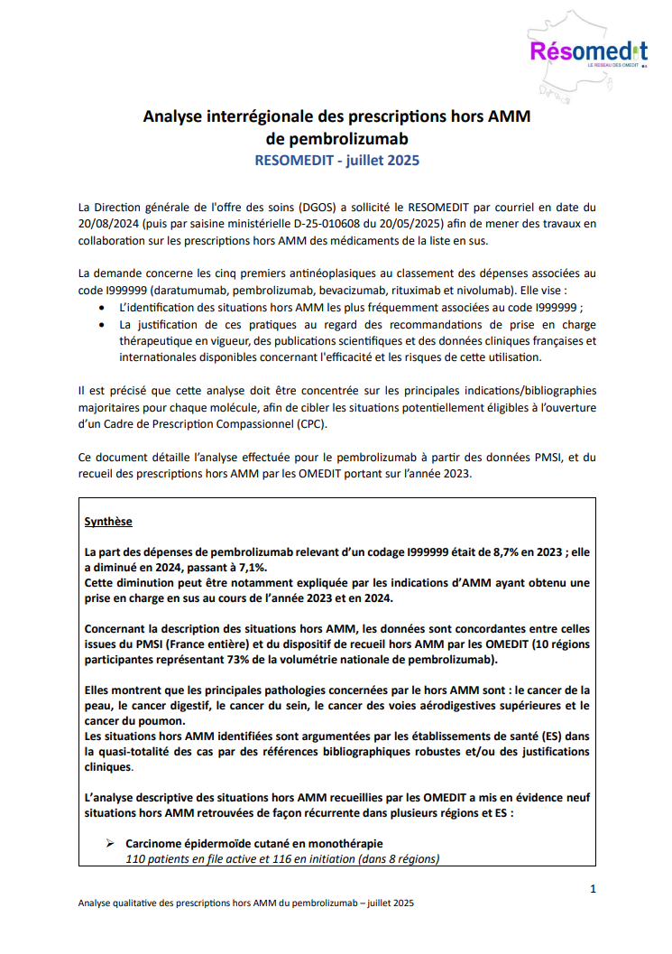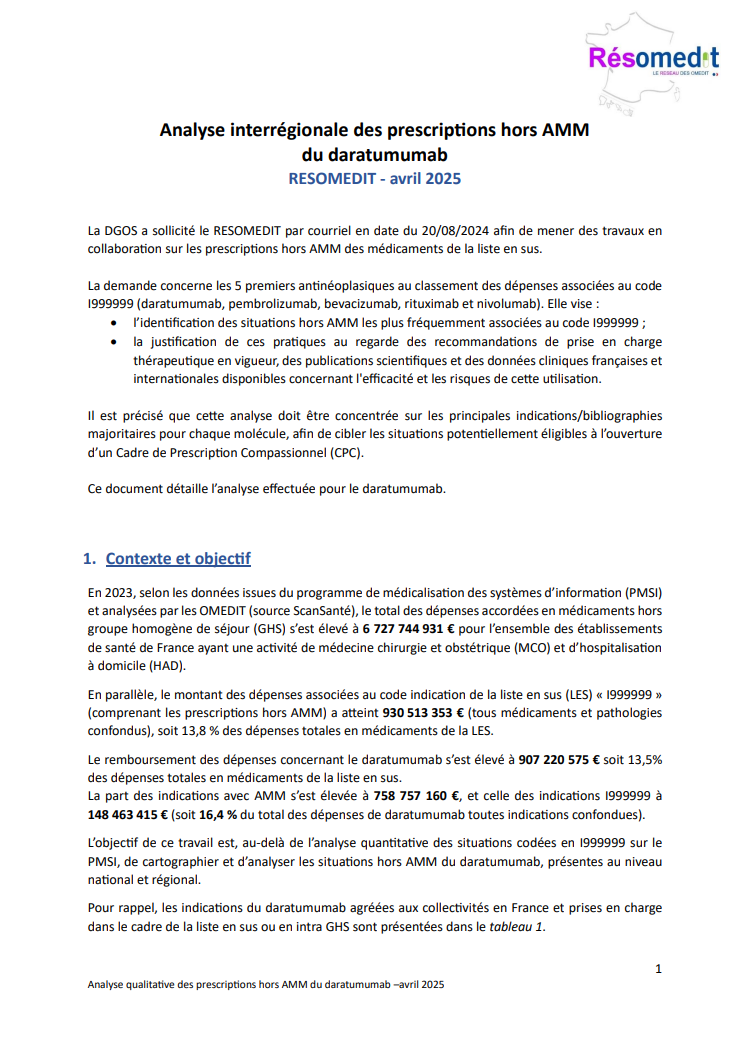 La Direction générale de l'offre de soins (DGOS) a sollicité le RESOMEDIT afin de mener des travaux en collaboration sur les prescriptions hors AMM des médicaments de la liste en sus.